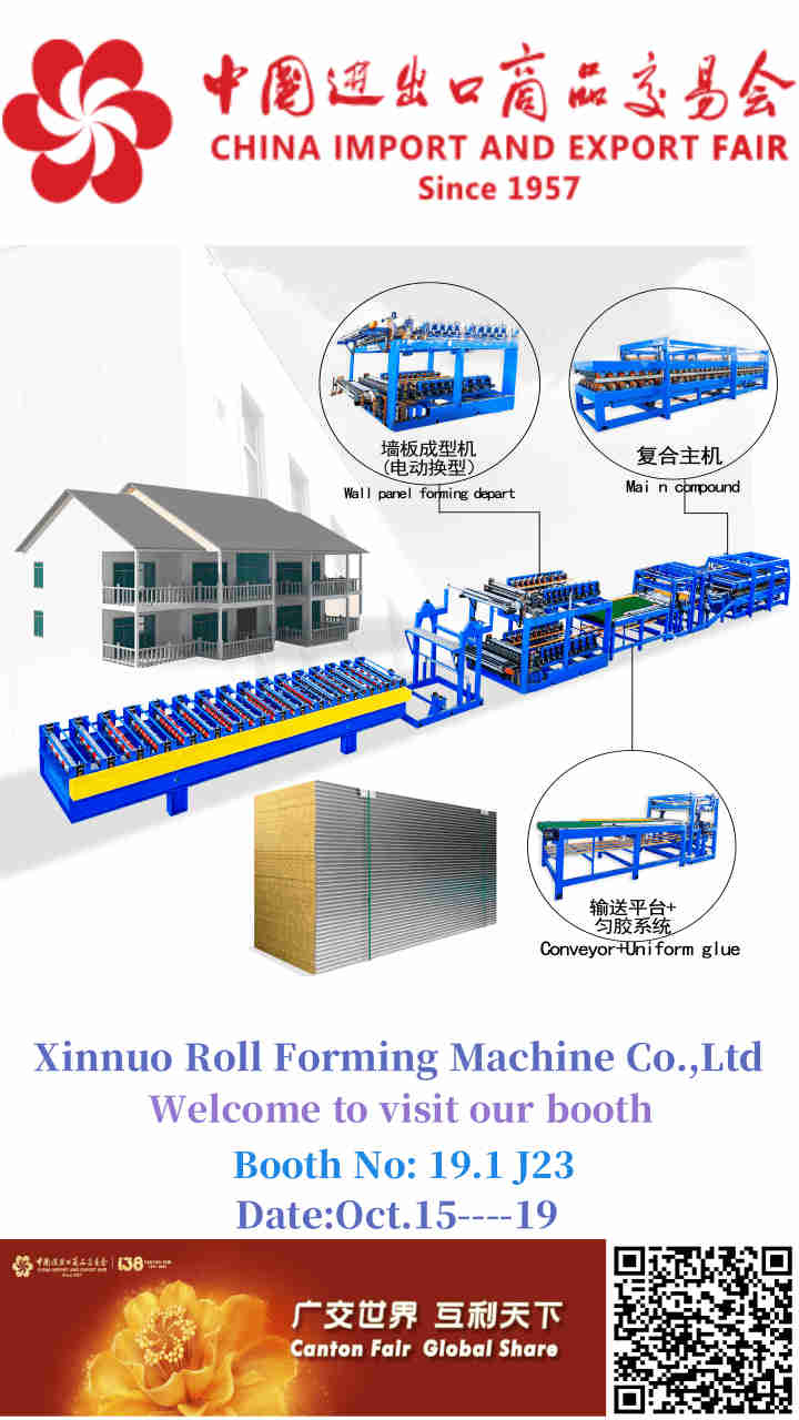This time, Xinnuo Roll Forming Machine Co., Ltd will showcase our core roll forming equipment at the 138th Canton Fair with great fanfare~ At the exhibition, you can not only get a close-up view of the complete set of equipment including “Wall panel forming depart (electric type change)”, “Main compound machine”, and “Conveyor + Uniform glue system”, but also directly experience the efficient intelligent manufacturing process of building panels from forming to compounding